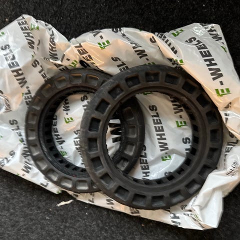 Dekket ligger klart til montering – bare skifte på og pumpe opp (tubeless krever ofte litt såpe/vann for å sette seg).