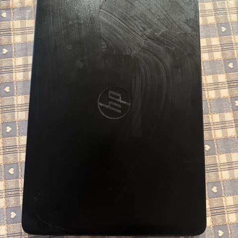 Bærbar datamaskin fra HP med lokk i grått med strukturert overflate og HP-logo i midten. Enheten har hengslet skjerm og innebygd tastatur (ikke synlig på bildet). Strømledning følger med på bildet. Egnet til generell bruk som tekstbehandling, nettlesing og enkel kontorarbeid.