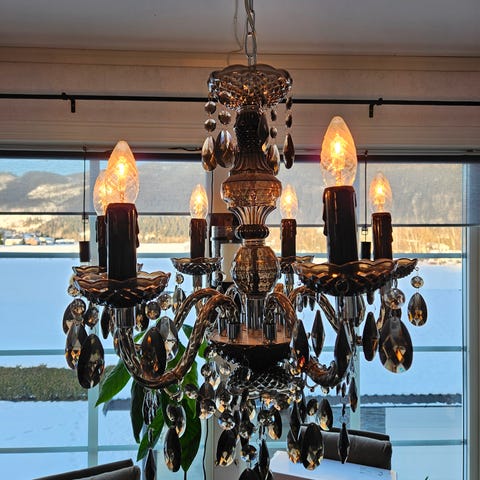 Lyskrone i stål og glassprismer selges
