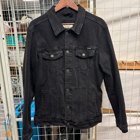 Pull&Bear denimjakke for herre i størrelse M. Jakken er i blå denim med mørke ermer i kontraststoff. Klassisk front med knappelukking og brystlommer med klaff og knapp. Egnet som lett ytterjakke i hverdagen.