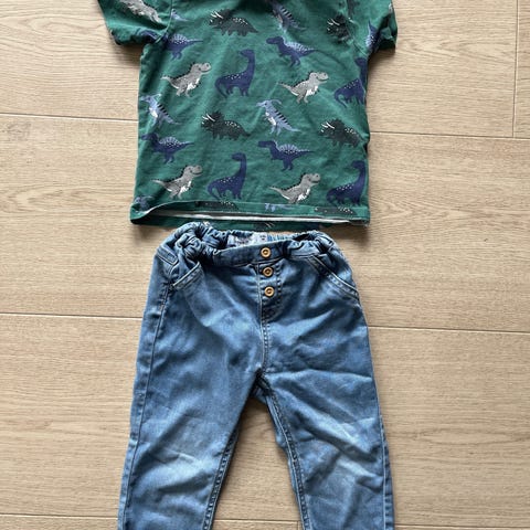 Myk jeans fra H&M i størrelse 80. Den er ikke stiv i stoffet, men lett og myk. Buksen er i blå denim-look med strikk i livet (som kan justeres) for god passform. En synlig flekk på kneet som jeg ikke har fått bort og et par lite synlige på andre kneet.
