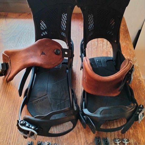 Ai beskrivelse: Vimana snowboardbindinger i lilla med svarte stropper og høy ryggstøtte. Bindingene har justerbare ankel- og tåstropper med spenner for presis tilpasning til støvlene. Egner seg til bruk på snowboard i alpinbakke og frikjøring. Passer for brukere som trenger stabile og støttende bindinger til vanlig snowboardkjøring.