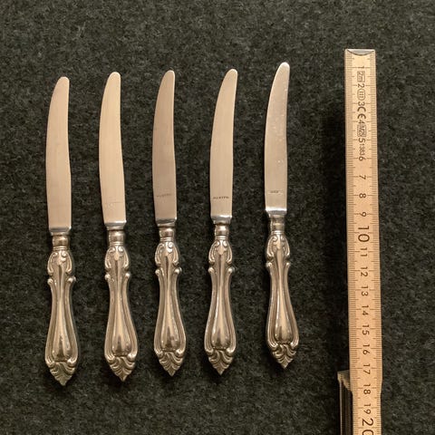 8 pent brukte fruktkniver, bladet er rustfritt, men usikker på håndtaket. Manglende oksydering tyder på at det ikke er sølv. Fra 50-70 tallet en gang.
