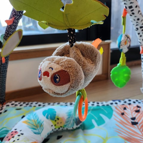 Fra nettsiden: Dette lette, bærbare babygymmet underholder små oppdagere med sine myke teksturer, en luksuriøst polstret matte, klaffer å åpne for å se hva som skjuler seg bak og tre morsomme dyrevenner som henger fra buene. Hvert dyr har en unik aktivitet, inkludert et giraffspeil, en apeklokke og en løve med raslelyd. Når leketiden er over, brett sammen gymmet og ta det enkelt med deg med det praktiske håndtaket for lek på farten.
