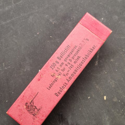 Raufoss Ammunisjonsfabrikker 6,5 mm D-projektiler i original pappeske.