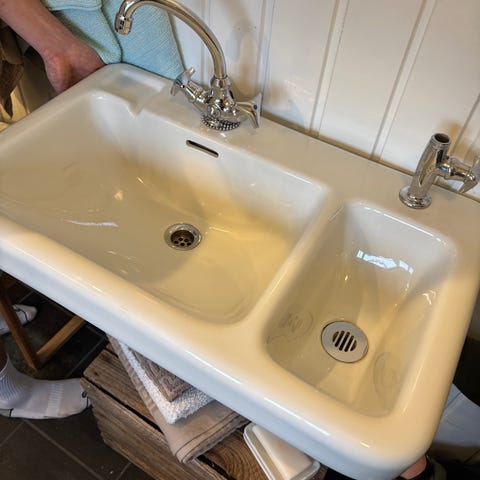 Vasken er hel, men har normal aldersslitasje og litt krakelering i glasuren – akkurat slik gamle porselensvasker ofte har.
