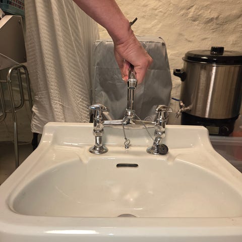 Den har stått på et soverom i et hus fra 1936 og har et tydelig stempel med «Deutsches Fabrikat». Kranene følger med.