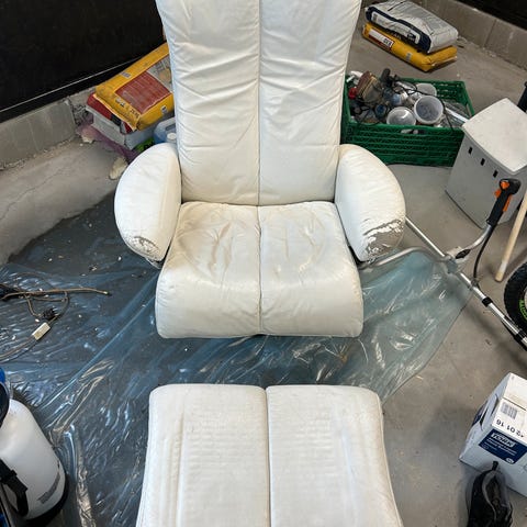 Ekornes Stressless med pall i god stand fra ca 1980, men med slitasje på armlener.