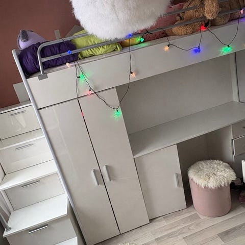 Praktisk og plassbesparende kombiseng med pult, skuffer og skap. Det er satt inn ekstra hyller i skapet for mer oppbevaringsplass. Pent brukt, men med noen bruksmerker på stigtrinn og pultplate. Kjøpt ny på Skeider i 2019. Demonteres før henting. Monteringsanvisning følger med. Selges uten madrass.