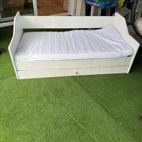 Fin og hel barneseng med fint mønster på innsiden. Sengen er b x h x l = 66 x 71 x 84 cm. Kan trekkes ut til 155 cm.