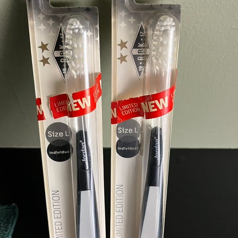 To sett: tannbørster med liten tube tannkrem, disse er pakket inn i plast, og er supre å ha med på reise.