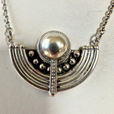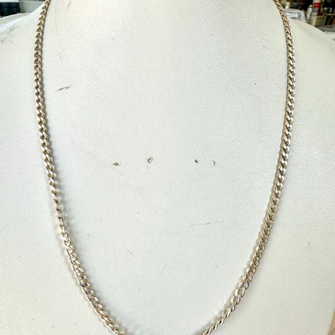 Denna är i s990 silver alltså 99% silver. Den väger 13.06g och är ca 2.7 cm lång. Jag vet inte vad som står på den.