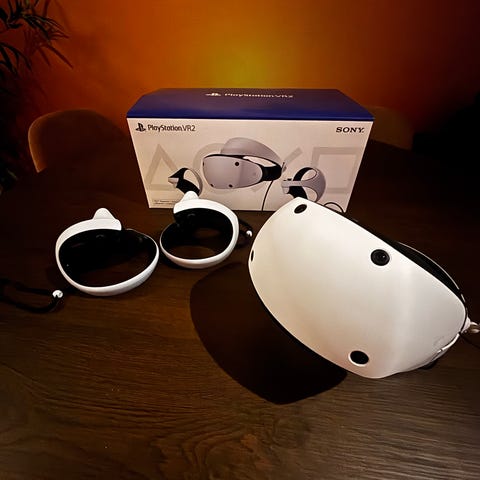Sony PlayStation VR2 VR-headset med tilhørende VR-kontrollere og tilkoblingskabler.