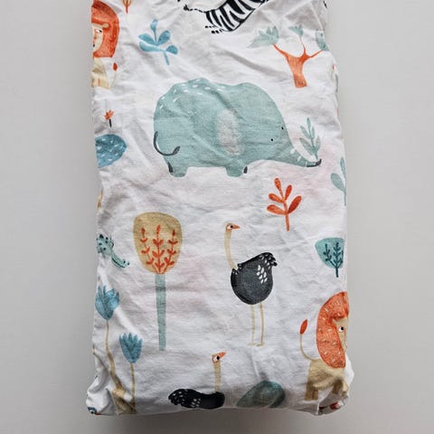 Sengesett med dynetrekk og putevar samt tøypose til oppbevaring. Dynetrekk størrelse 65 * 80 cm. Giraff i fly. 100 % organisk bomull. Normal bruksslitasje.