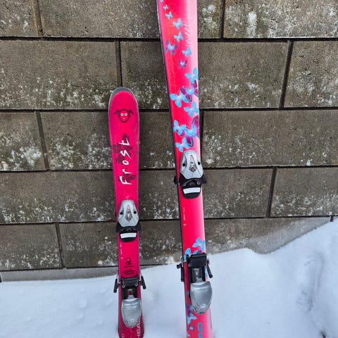 Alpinski i rosa farge med integrerte bindinger. Skien har sommerfuglmotiv og er egnet for barn. Passer til bruk i alpinbakke for nybegynnere og viderekomne barn.