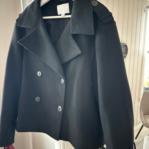 H&M jakke i flerfarget design for dame i størrelse M. Jakken er laget i polyester og har mørk hovedfarge med lyserosa ermer. Den har glidelåslukking foran og ribbekanter med stripemønster ved hals, ermer og nederkant. På brystet er det en liten tekstdetalj. Jakken passer som en lett ytterjakke eller som et lag over annet tøy i hverdagen.