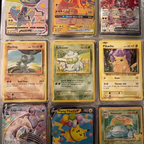 Pokemon samlekort mappe med diverse kort. Bildene viser flere korttyper, blant annet EX-, GX- og V-kort, samt vanlige og holografiske kort. Kortene ligger i plastlommer i permer, og enkelte kort er i individuelle plastbeskyttere. Egner seg som utgangspunkt for en samling eller som tillegg til eksisterende samling. Antall kort og eksakte utgaver fremgår ikke fullt ut av bildene og bør eventuelt avklares nærmere med selger.