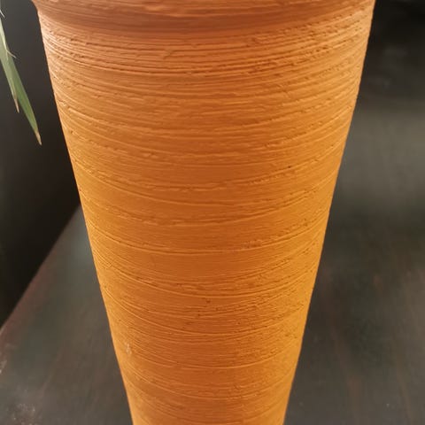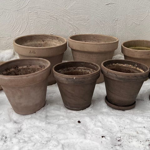 To terrakotta blomsterpotter i glasert oransje farge. Klassisk rund form med lett innsvinget midtparti og markert kant øverst. Egnet for planting av blomster og grønne planter inne eller ute, avhengig av behov. Potten har ikke dreneringshull i bunnen og brukes sammen med medfølgende innerpotter m skål. Høyde ca 20 cm, diameter ca 25 cm. Hver potte veier ca 2,3 kg. Bør hentes.