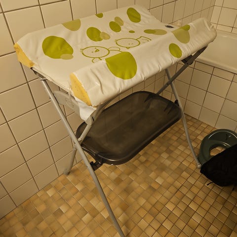 Selve bordet er brukt som stellebenk i et halvt år, og så som sminkebord i halvannet år etter det.