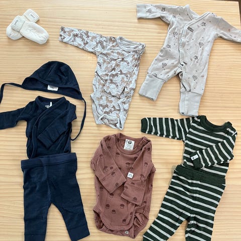 Alt er pent brukt, men den ene pysjen i bambus har fått noen små hull som ikke er av betydning for bruken, det samme med en bukse og en body (se bilde)