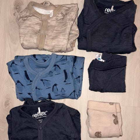 Tykk ulldres fra Reflex, 4 pysjer(2ull), 6 bukser(3ull), 6 omslagsbodyer(3ull), 2 gensere/jakker, div luer (4ull) og sokker.