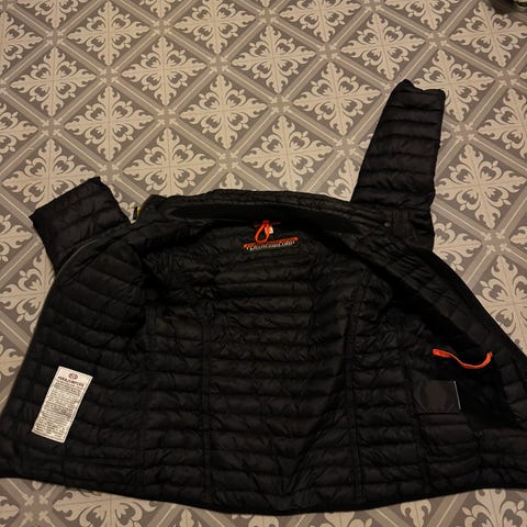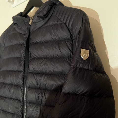 Abercrombie & Fitch dunjakke for dame i størrelse M. Jakken er svart og vattert med dun, med horisontale sømmer som gir jevn fordeling av fyllet. Modellen har glidelåslukking foran og logo-patch på ermet. Egnet som lett ytterjakke i kjøligere vær.