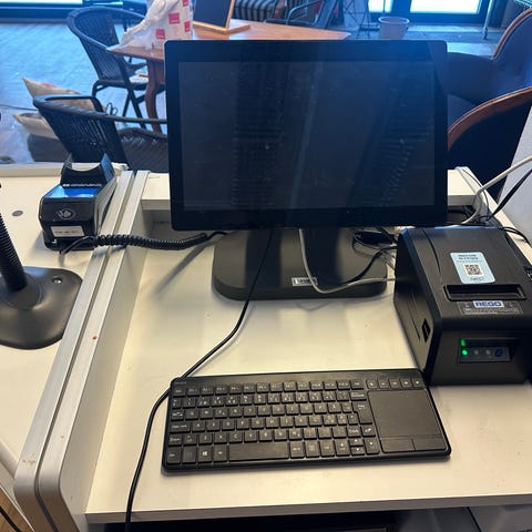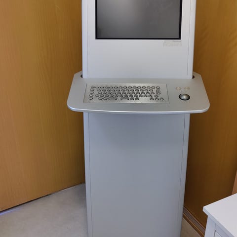 Interaktiv touchskjerm på frittstående hvitt stativ. Den er brukt tilnå vise meny på restaurant . Kjører android grensesnitt. Selger to stk. Den ene er i bruk per idag , mens den andre må repareres ( sannsynligvis skifte led inger til maskinen) .