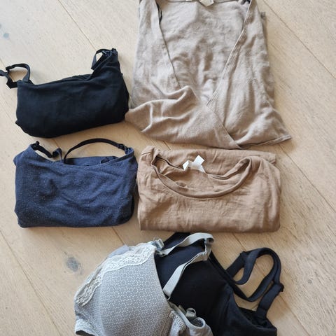 Diverse ammesingletter, ammebher og en ammegenser. Selges helst samlet, men gjerne kom med bud om du ønsker enkeltplagg eller deler av pakken. Det meste er godt brukt, men har mye bruk igjen. Det meste er str S, men noe er M, men alt er brukt av meg som er en S/M. Klærne har merker som H&M, purpless, Lindex, careless, Cubus og Medela.
