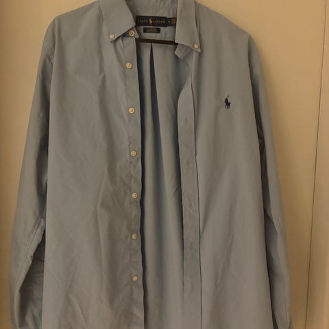 Ralph Lauren skjorte for herre i størrelse L. Skjorten er laget av bomull og har blått rutemønster med knappelukking foran og knapp på kragen. Klassisk brodert logo på brystet. Passer til både hverdagsbruk og mer formelle anledninger.