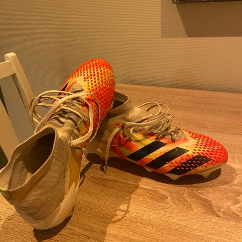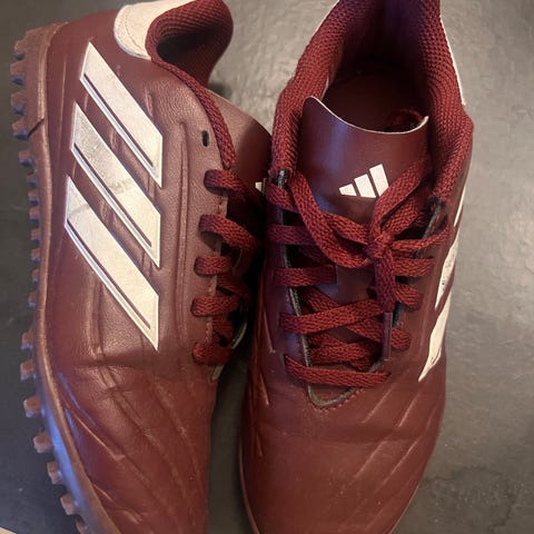 Adidas fotballsko med knotter i burgunder med hvite detaljer. Overdelen er i syntetisk materiale, og sålen har flere små knotter som gir feste på kunstgress eller harde underlag. Lissesnøring over vristen gir justerbar passform. Egnet som fotballsko for trening og kamp på baner med kunstgress eller hardt dekke. Kun brukt et par ganger.