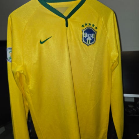 Nike Brasil fotballdrakt i størrelse M. Drakten er gul med grønne detaljer og Brasil-landslagets emblem på brystet. V-hals med grønn krage og korte ermer med grønne felt. Laget i lett og pustende materiale egnet for fotball og annen fysisk aktivitet. Passer som supporterdel eller treningsplagg.