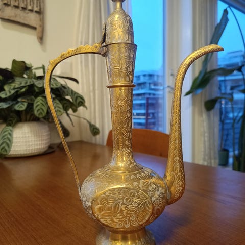 Jeg selger en nydelig, antikk kaffekanne med klassisk dekor. Kannen har en elegant, rillet form (kanellering) og et flott detaljert trehåndtak som gir den et unikt og tidløst preg.