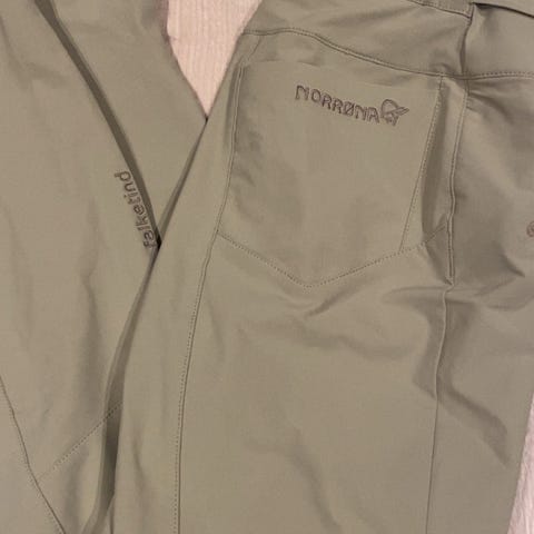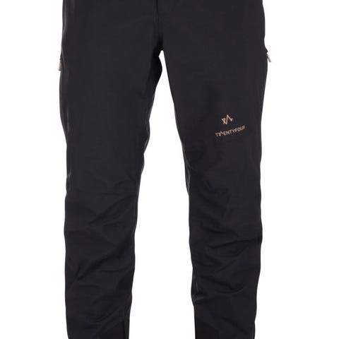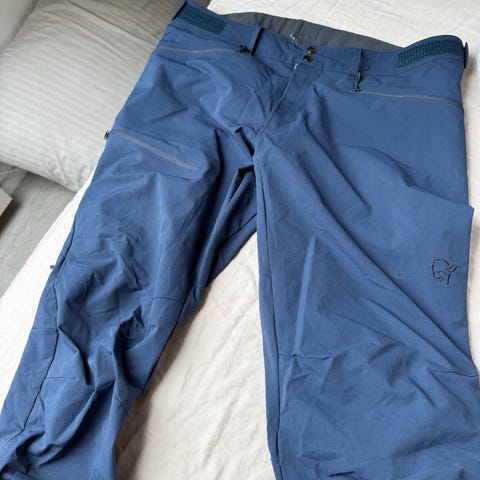 Norrøna skallbukse i svart farge. Buksen har glidelås nederst på bena og trykknapper ved anklene. Stoffet er i teknisk materiale tilpasset bruk som ytterbukse i vått og vindfullt vær.