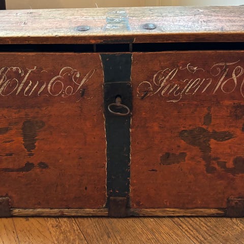 Antikk trekiste i brun utførelse. Kisten har metallbeslag, håndtak på sidene og front, samt låsebeslag foran. Innvendig er den ubehandlet treverk med god lagringsplass. Egner seg til oppbevaring av tekstiler, utstyr eller som møbel og interiørdetalj. Merke og eksakt modell er ikke oppgitt.
