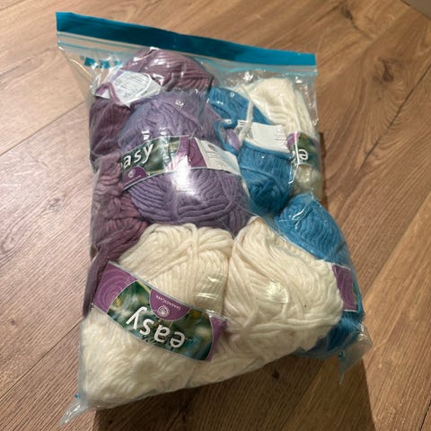 Flere nøster i ulike farger, blant annet hvit, oransje, rosa, lilla, blå og beige. Garnet ligger sortert i plastposer. Egnet til strikking av klær og sokker