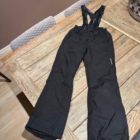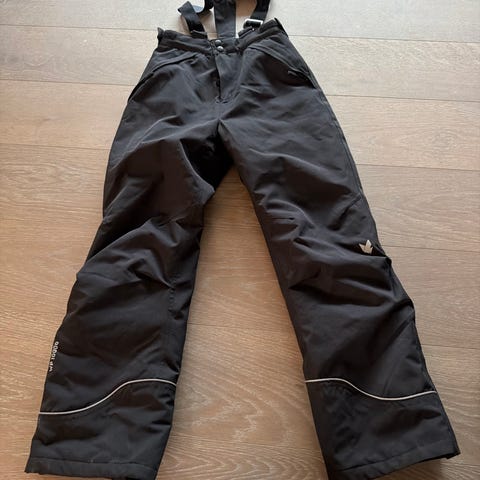 Skogstad barnebukse i størrelse 164. Buksa er svart og har seler som kan justeres. Den har glidelåslommer foran og strikk nederst ved bena for bedre passform. Egner seg til bruk ute, for eksempel til lek og annen aktivitet i variert vær.