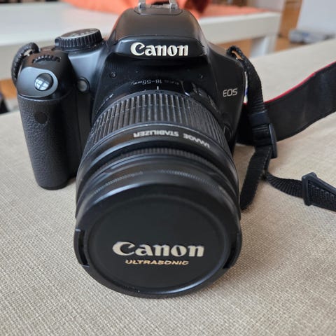 Pent brukt Canon EOS 500D speilreflekskamera med utskiftbart zoomobjektiv. Kameraet har innebygd skjerm på baksiden for visning av bilder og menyer, samt optisk søker.