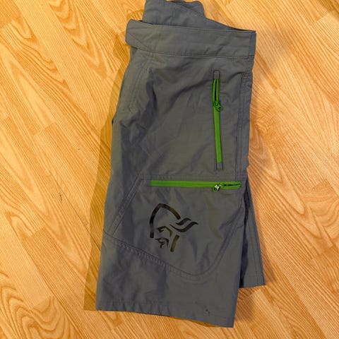 Norrøna turshorts for barn i størrelse 146. Shortsen er grønn med blå glidelåser og logo. Den har flere glidelåslommer i siden og bak, samt justering i livet med borrelås. Egnet til fotturer og annet friluftsliv.