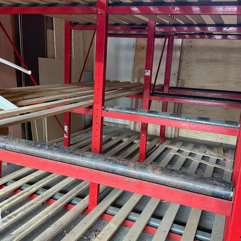 Palle reol Her er det plass til 45 Palle plasser. Det følger med 5 stiger . 22 stk bære jern . Hentes i Moss ferdig demontert. Er reolen du ser på bilde selges kr 12.000.- eks mva