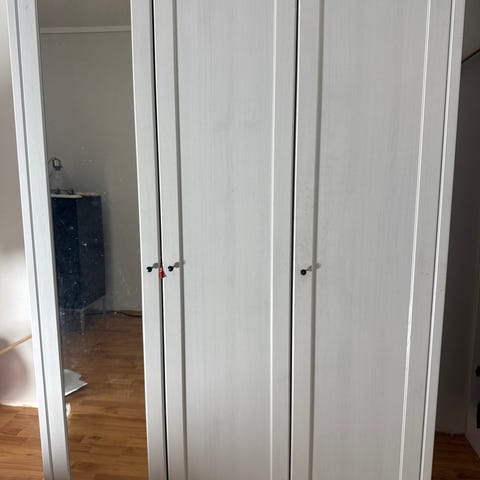 IKEA garderobeskap med skyvedører og speil. Skapet har store speilfronter som dekker skyvedørene og gir god speilflate i rommet. Ramme og profiler er i lys, nøytral farge. Egner seg til oppbevaring av klær og tekstiler på soverom eller i gang, og gir samtidig ekstra romfølelse på grunn av speilflatene. Designer oppgitt som Alvar Aalto.