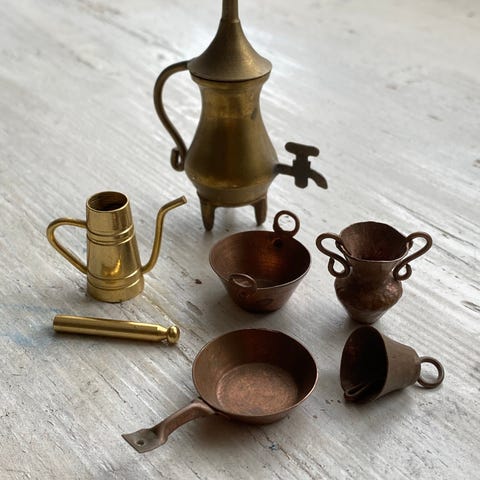 Settekasse figurer / figurer til settekasse / småting i messing / miniatyrer i messing / små messing ting / miniatyr skrin / miniatyr kanne / miniatyr krukke / vintage miniatyrer settekasse / vintage kobber småfigurer / vintage tinn (?)