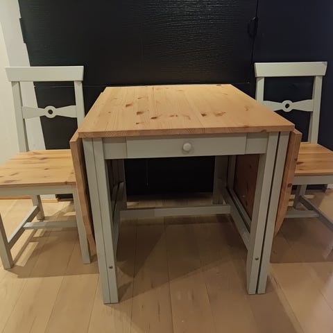 Kjøkkenbord med bruksmerker selges. Har en forlenger klaff på ene kort siden. Forlenger bordplate med 40 cm. 4 stoler. Puter kan følge med. Må hentes Bønes.