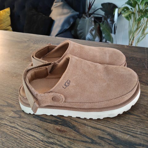 UGG Goldenstar i størrelse 39 i chestnut farge. Modellen har åpen hæl med justerbar rem som kan brukes bak hælen eller over vristen. Selges da de ble for store for meg. De er kun brukt 2 ganger og da i hovedsak innendørs.