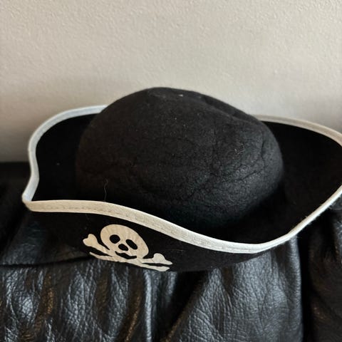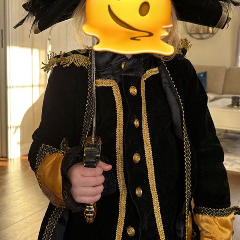Selger brukt Kaptein Sabeltannkostyme størrelse 6 med sjørøver hatt. Lekepistol, medaljonger og sjørøverkart.