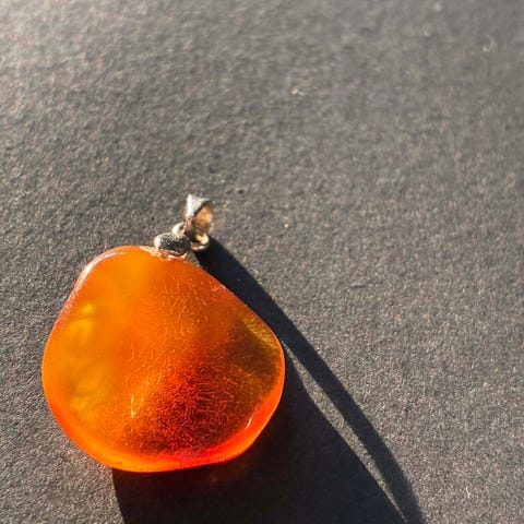 Vakkert anheng i månestein, ca. 2 cm langt. Anhenget er formet som et lite hjerte/triangel, med oppheng i metall. Leveres med praktisk pose med snøring.