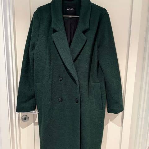 ICHI kåpe for dame i størrelse S. Kåpen er blågrønn og har en klassisk, rett fasong med krage og knappelukking foran. Materialet inneholder 40 % ull, noe som gir varme, kombinert med andre fibre for slitestyrke og formstabilitet. Egner seg som ytterjakke i overgangssesonger og mildere vinterdager.