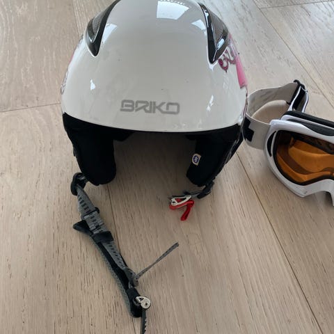 Briko Mammoth skihjelm i størrelse XS (48–52 cm). Hjelmen er i fargene blå og rød, med justerbar stropp og øreklaffer. Ventilasjonsåpninger i skallet og feste bak for skibriller. CE-merket. Pent og lite brukt av ett barn.