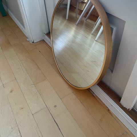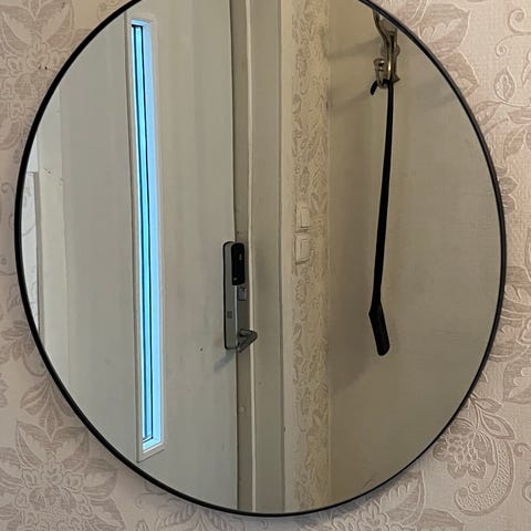 Rundt speil uten ramme. Til bad, gang el. Henges opp med feste (se bilde). Ingen riper eller merker.