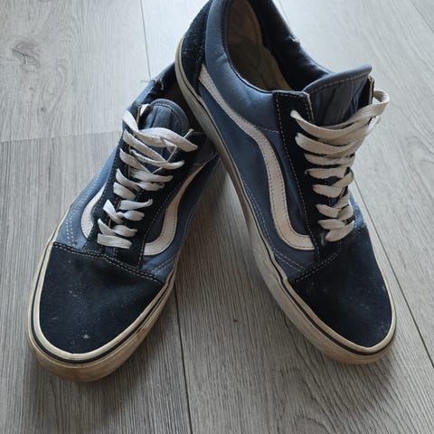 Vans Old Skool sneakers i størrelse 42. Klassisk skatemodell med lav profil, snøring og karakteristisk side stripe. Skoene har overdel i tekstil og semsket materiale med gummisåle. Fargekombinasjon i blått og hvitt. Passer som hverdagssko eller til skatebruk.