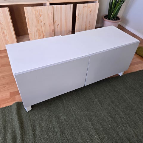 Stødig TV-benk med to skuffer som fungerer fint og en praktisk åpen hylle.